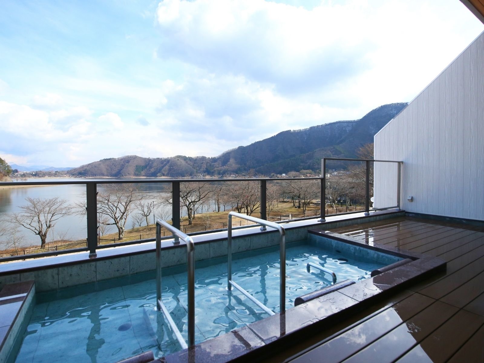 河口湖を望む展望大浴場に、星空を見ながら入浴可能な露天風呂(露天寝湯)