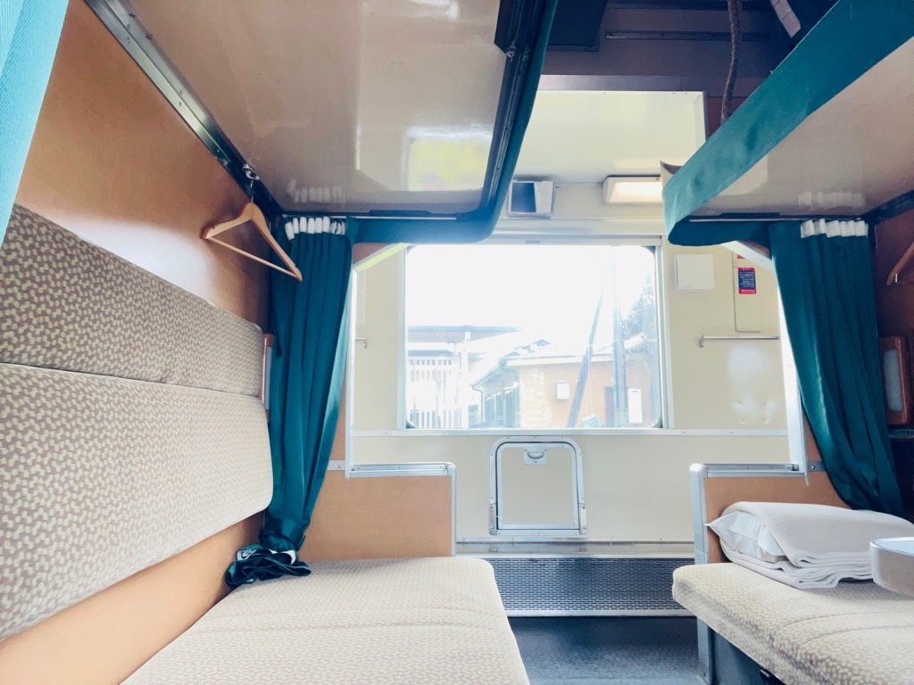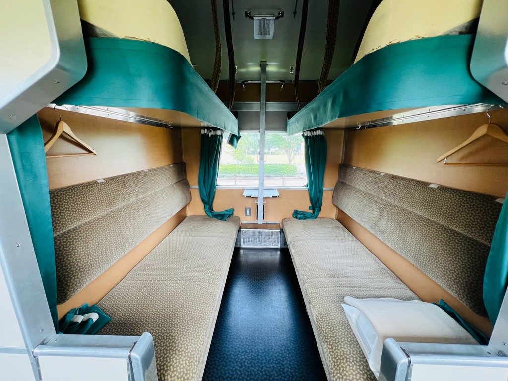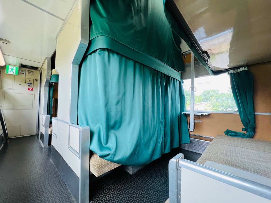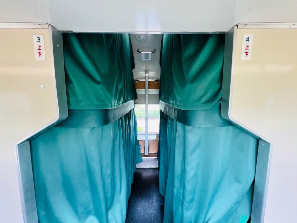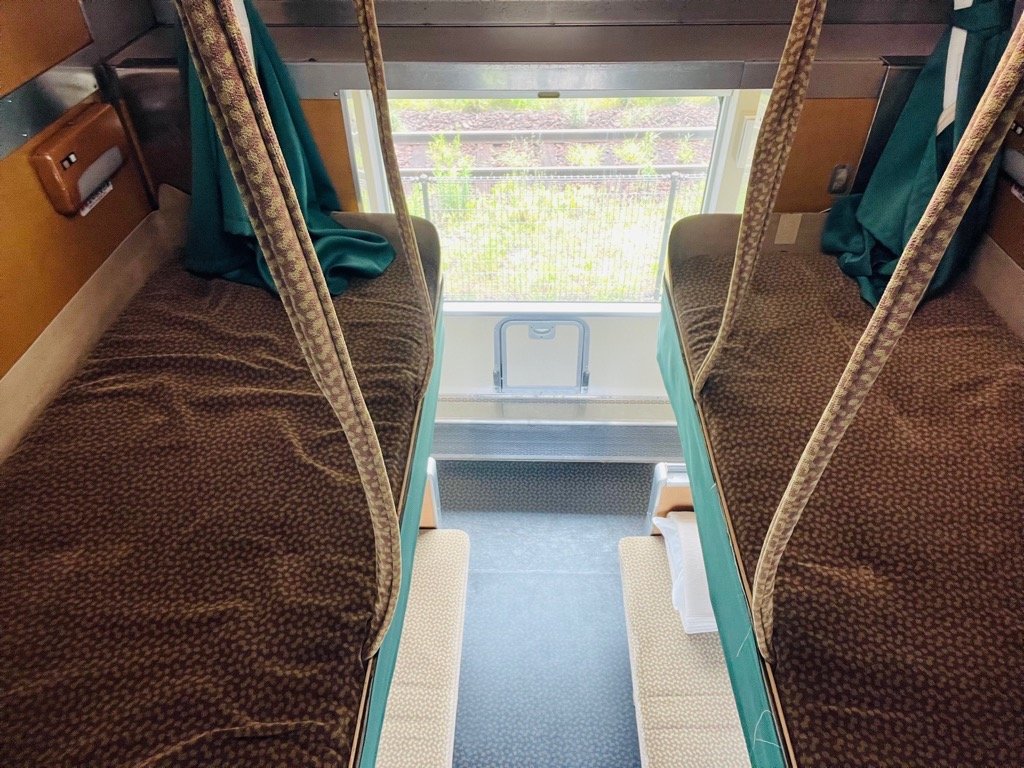 昔ながらのオープンタイプの寝台車で、廊下とお部屋を隔てる扉はございません。