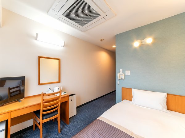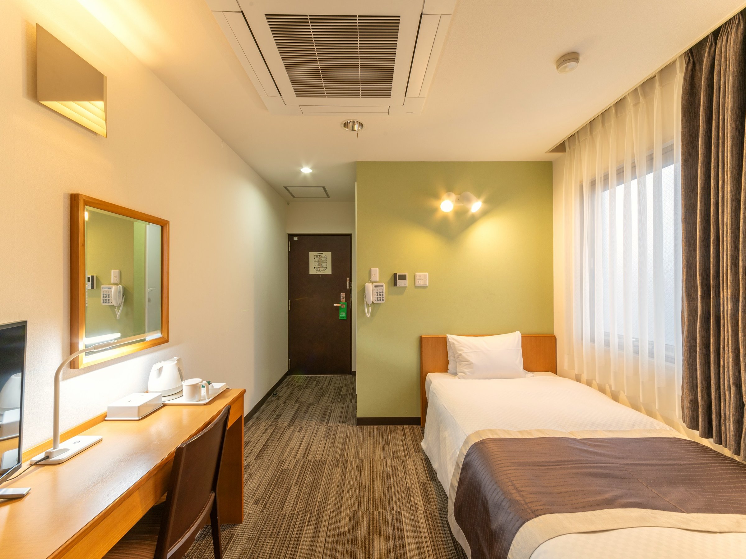 シングルルームは14.2㎡。【 客室設備 】シモンズ社製ベッド6.5インチ32型液晶テレビ(一般・有料チャンネル)ウォシュレット、冷蔵庫、電気ポット、電話、空気清浄機(数に限り有り)【アメニティ】浴衣、シャンプー、リンス、ボディソープ、スリッパヘヤドライヤー、歯ブラシセット、タオル、バスタオルカミソリ、煎茶