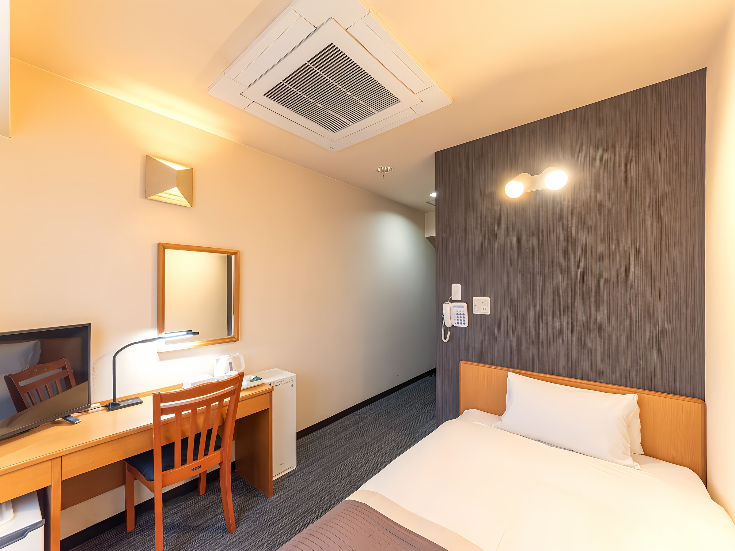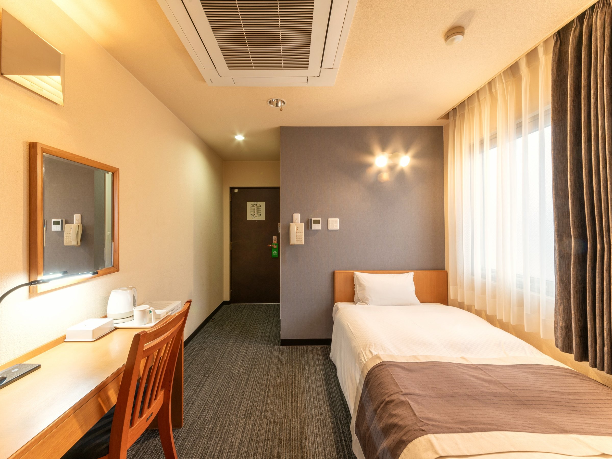 シングルルームは14.2㎡。【 客室設備 】シモンズ社製ベッド6.5インチ32型液晶テレビ(一般・有料チャンネル)ウォシュレット、冷蔵庫、電気ポット、電話【アメニティ】浴衣、シャンプー、リンス、ボディソープ、スリッパヘヤドライヤー、歯ブラシセット、タオル、バスタオルカミソリ、煎茶