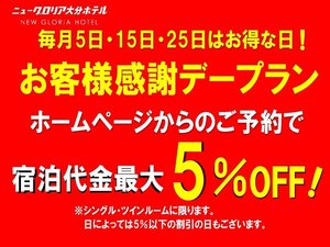 HP限定!毎月5がつく日(5日/15日/25日)は5%OFFでお得に泊まれるプランです♪