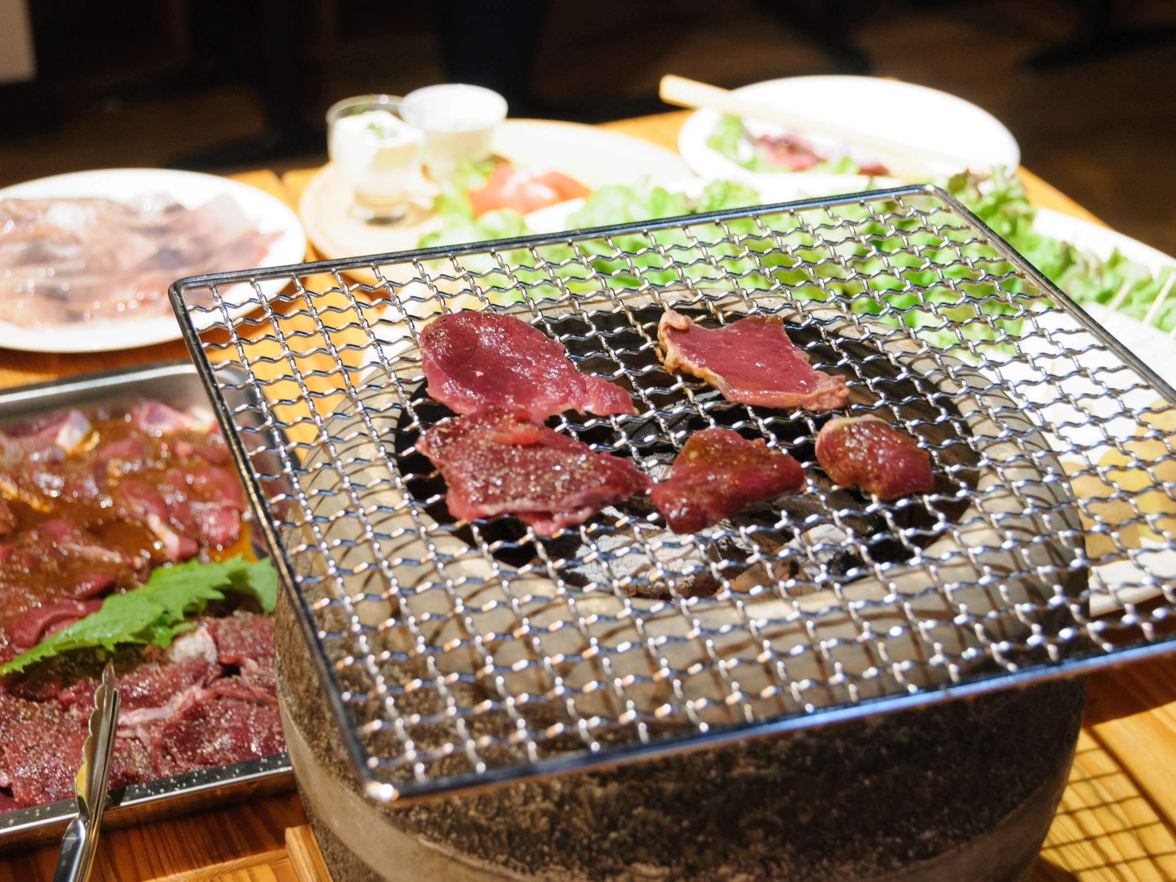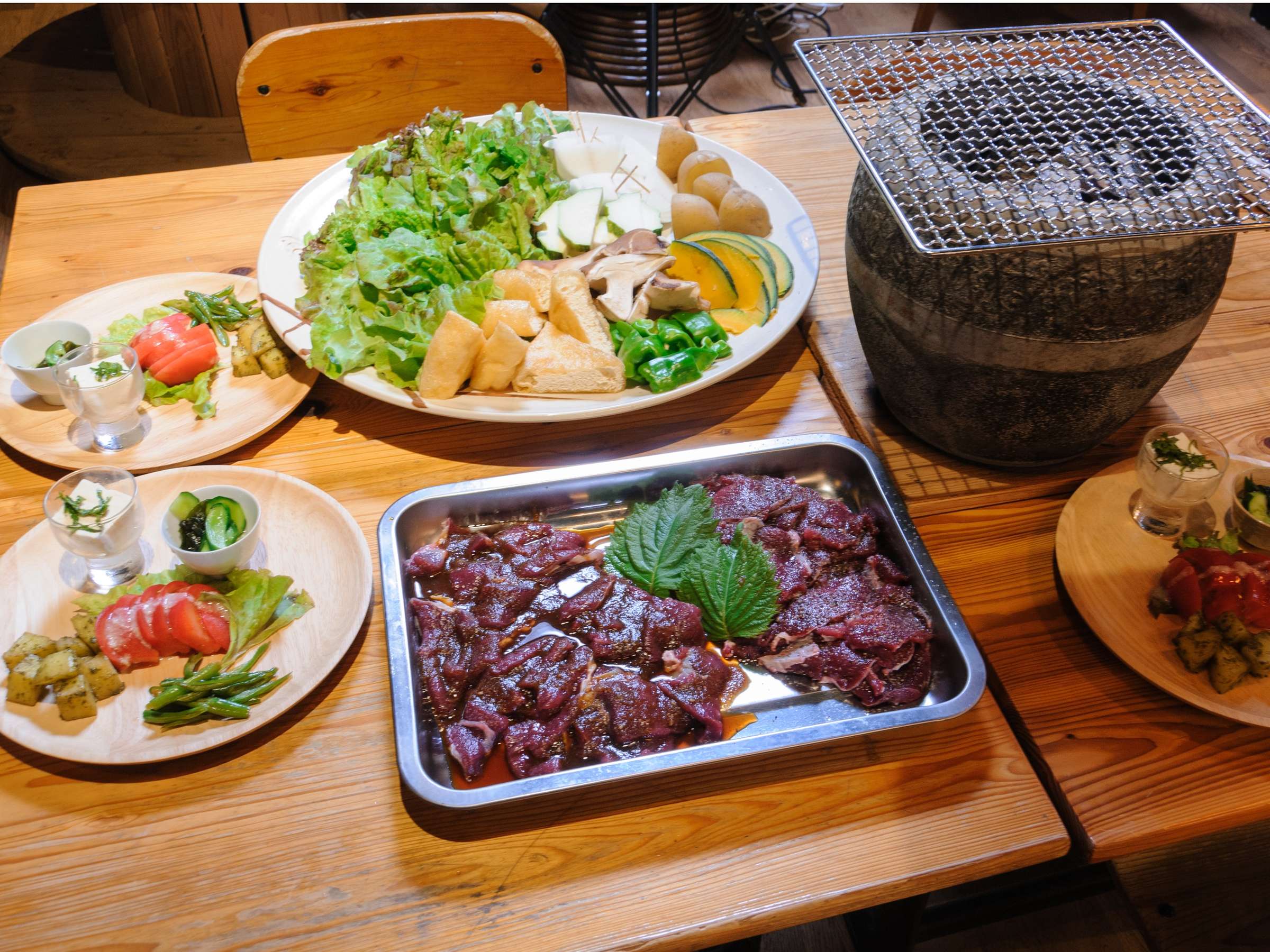 ジビエ(鹿肉)コース。七輪焼きコースです。要望で屋外BBQや鍋も対応できます。