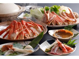 はまかぜ荘長年の松葉カニフルコース・刺身(かにさし・いか・えび)焼きかに・酢かに・ちりなべ・かに雑炊・デザート・香の物などご満足プラン。