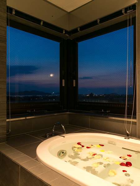 夕日がきれいなバスルームです。(花びらはイメージです)