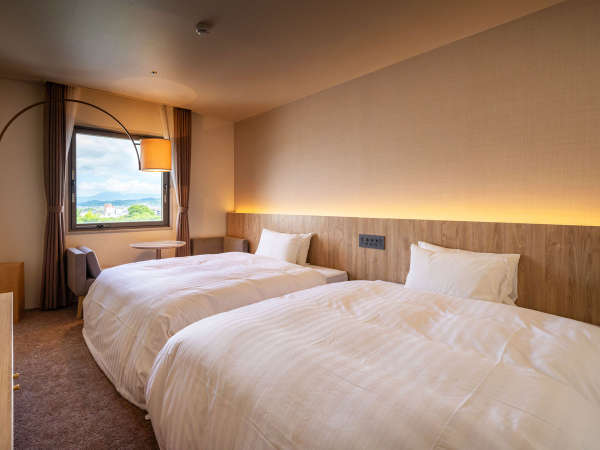 太陽の光が優しく広がる、落ち着いた雰囲気の空間。ソファから窓の外を眺めてのんびりと流れる時間をご体感いただけます。【客室詳細】セミダブル(120cm幅)×2台、ソファベッド、26平米ユニットバス、洗浄機付トイレ、無料Wi-Fi完備、禁煙【アメニティ】シャンプー・コンディショナー・ボディソープ・ハンドソープドライヤー・かみそり・歯ブラシ・ミネラルウォーター・お茶セット
