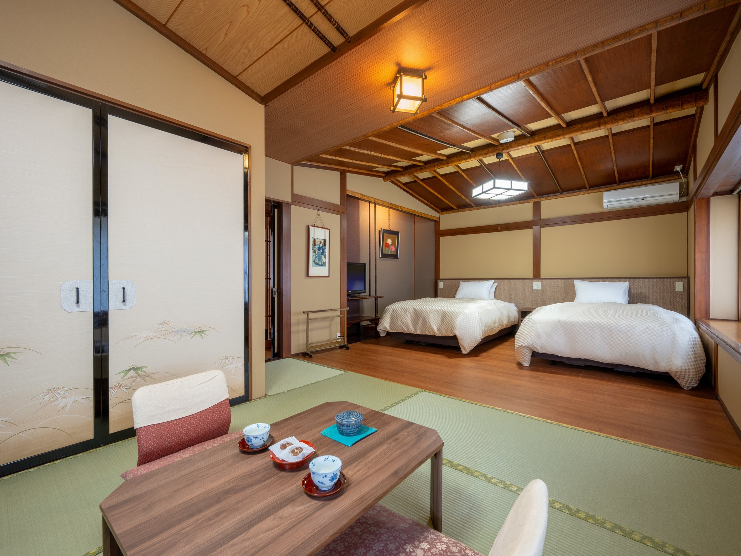 和洋室 12畳又は14.5畳 バスなしトイレ付きシモンズ製ベット2台*眺望なし【客室装備】ベット2台/洋式トイレ/洗面台/洗浄便座/金庫お茶セット/お湯ポット/水ポット空の冷蔵庫/冷暖房/毛布【アメニティ】タオル/バスタオル/歯ブラシセット/浴衣丹前/ひげそり 【大浴場】檜風呂 源泉かけ流しリンスインシャンプー/ボディ―ソープドライヤー*Wifi