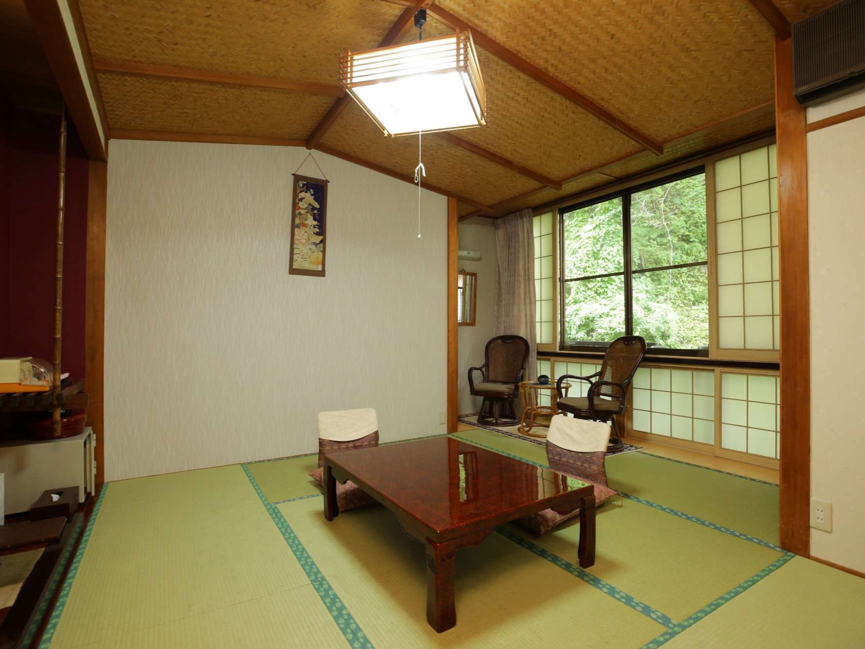 和室 8畳檜の風呂付客室 *湯船のお湯は、お客様自身でお入れ下さい。【客室装備】半露天風呂付客室/洋式トイレ洗浄便座/金庫お茶セット/お湯ポット/水ポット/空の冷蔵庫ドライヤー/毛布/ff式石油ストーブ/エアコン【アメニティ】タオル/バスタオル/歯ブラシセット/ドアイヤー洗顔料/化粧水/乳液/カミソリ/くし/ヘアーゴム浴衣/丹前*wifi フロント付近のみ
