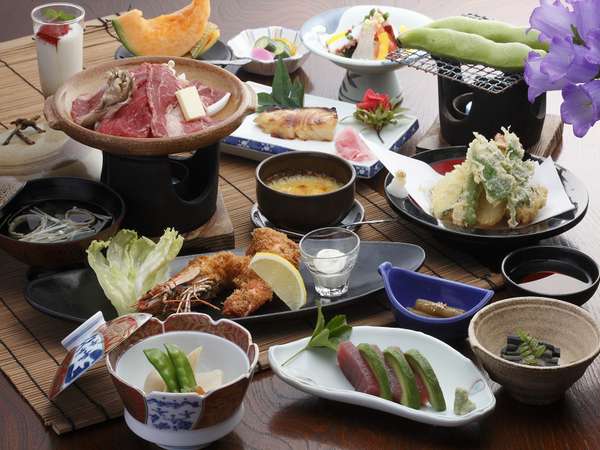 夕食お料理デラックス一例。季節の手作り料理をお部屋にご用意させていただいております。