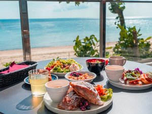 海を眺めながらわんちゃんと一緒に食事を楽しむひととき。