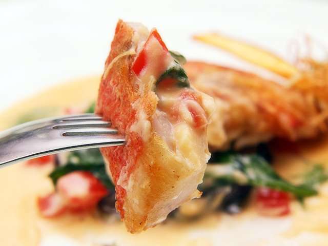 ディナーのメインディッシュの魚料理は、シェフのフレンチの技法を使った逸品です。