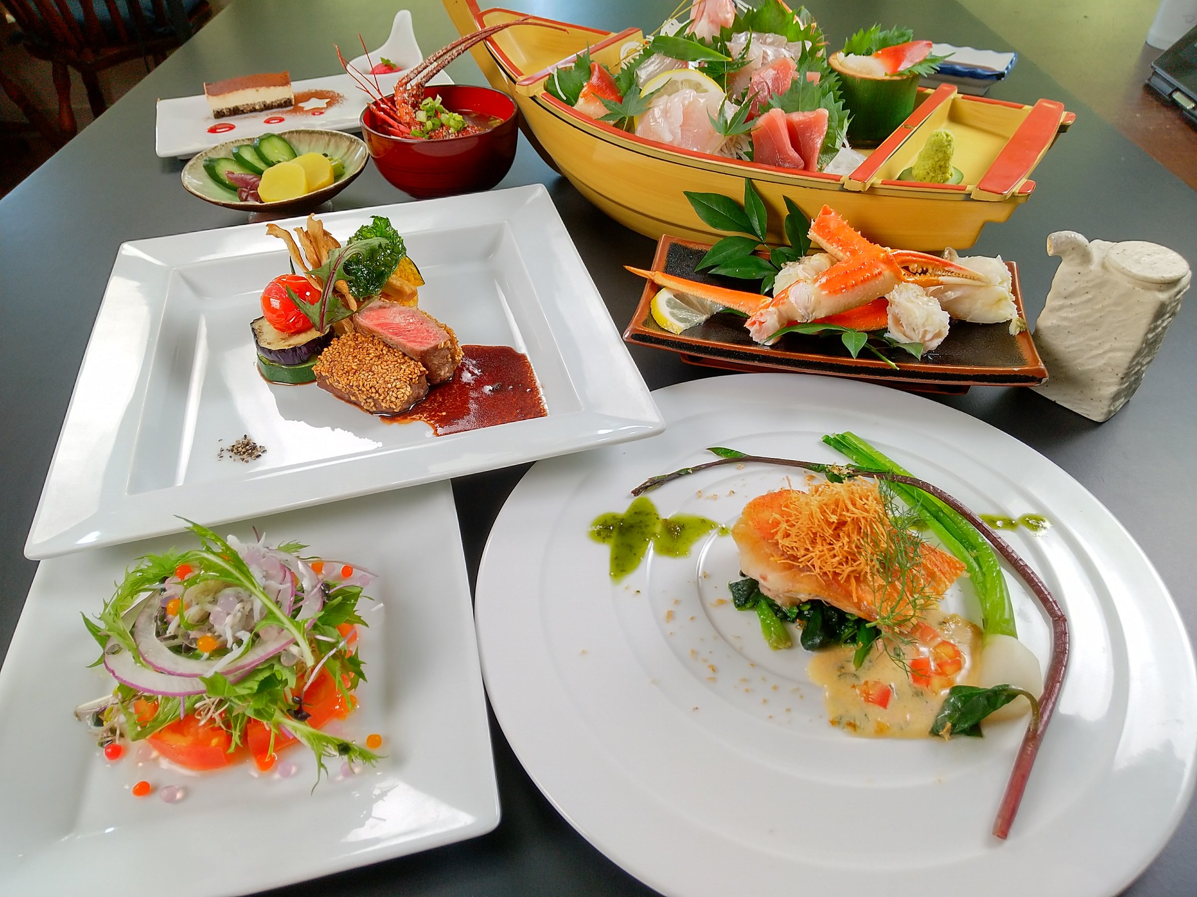 季節の和仏コースディナーの一例。お好みのお酒やワインとともに。