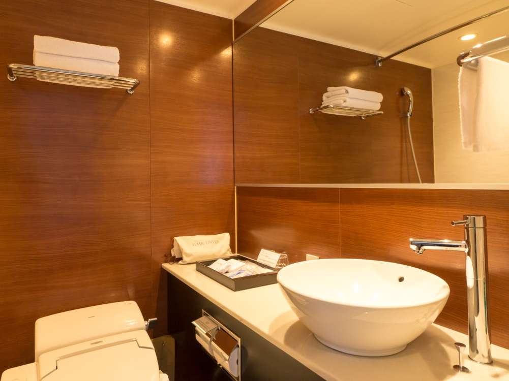 【バスルーム】お洒落な形の洗面台。バスタオル、フェイスタオル、ハンドタオルの3種類をご用意