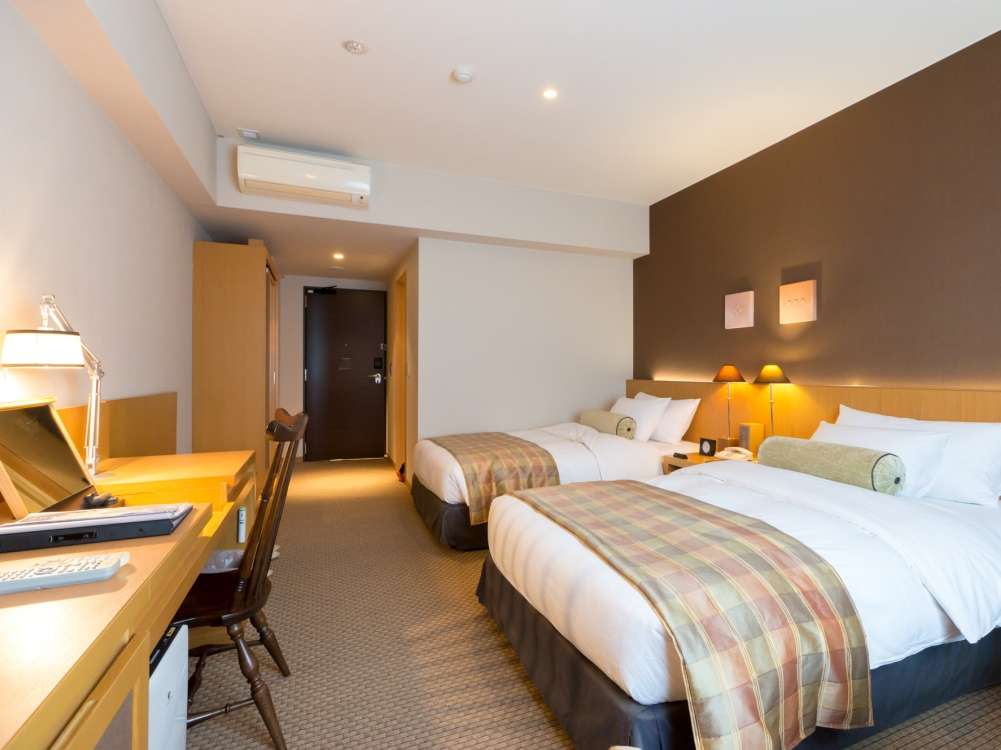 27㎡のお部屋にセミダブルベッド(120cm×200cm)を2台、マットレスは快眠できると評判の日本ベッド製造の高級マットレス「SILKY」をご用意しております。繁華街から離れ、また車道に面していないお部屋のため、夜は静かにお過ごしいただけます。