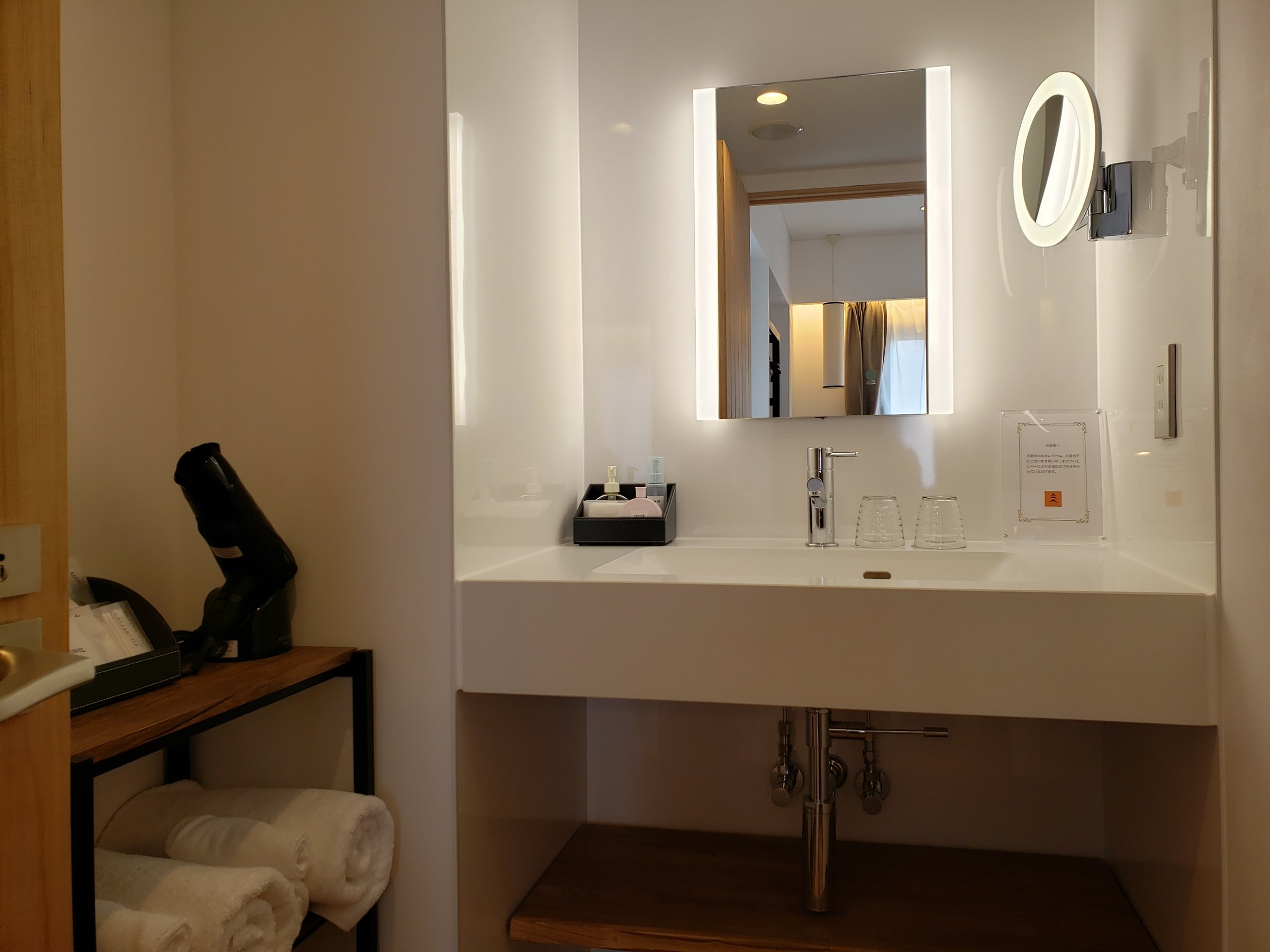 □大きな鏡のついた独立洗面台には拡大鏡も備え付けられており落ち着いて身支度を整えていただけます。