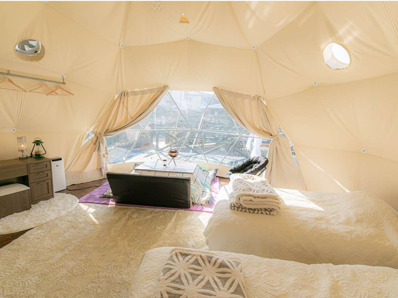 ドーム内には ダブルベッド2台、ソファー、エアコン、冷蔵庫、電子レンジ、ドレッサー、アメニティー付!