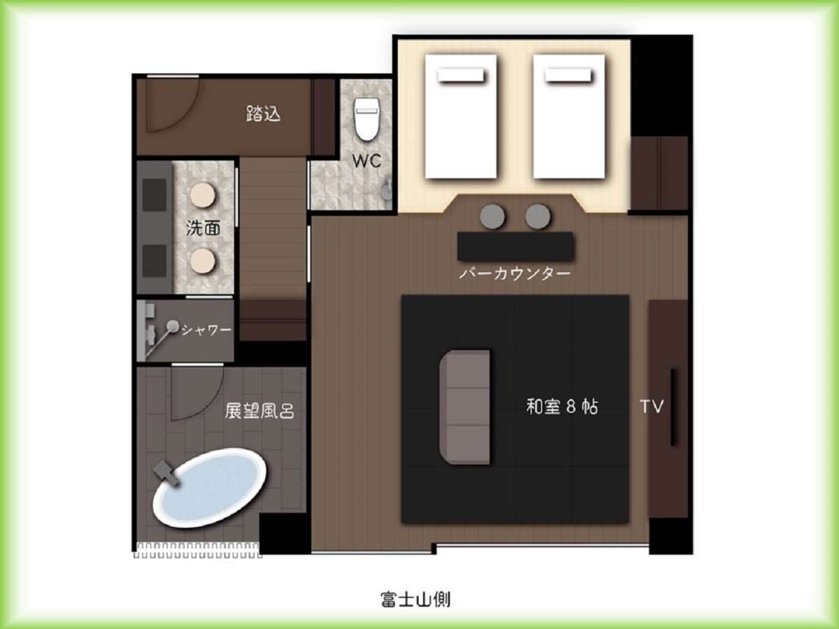 『別館』5階 禁煙ルーム 和洋室2021年4月新設富士山を真正面にご覧いただけるお部屋です。※天候により富士山が見えない場合がございます。河口湖はご覧いただけません。お部屋に展望風呂。(温泉ではございません)御食事付きで御予約の場合、夕食→個室朝食→レストランでございます。