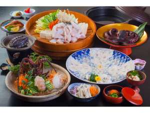 ふぐスタンダード会席に日間賀島名物のゆでたこと伊勢海老のお造りをお付けしたプラン...
