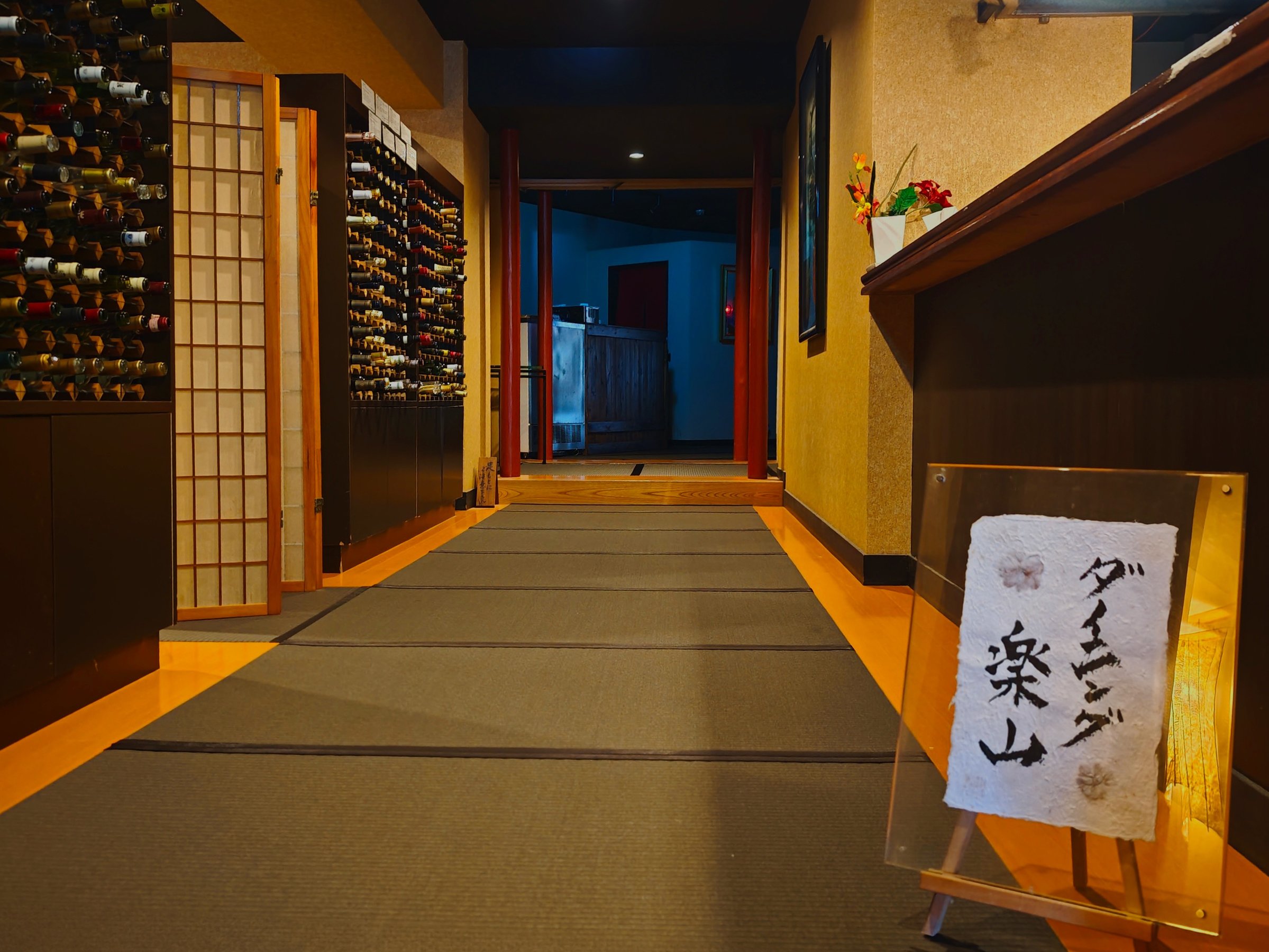 【ダイニング楽山】入り口 畳の廊下にワインセラーの輝き 和の情緒と洋の機能美が融合 美食の時間の始まり