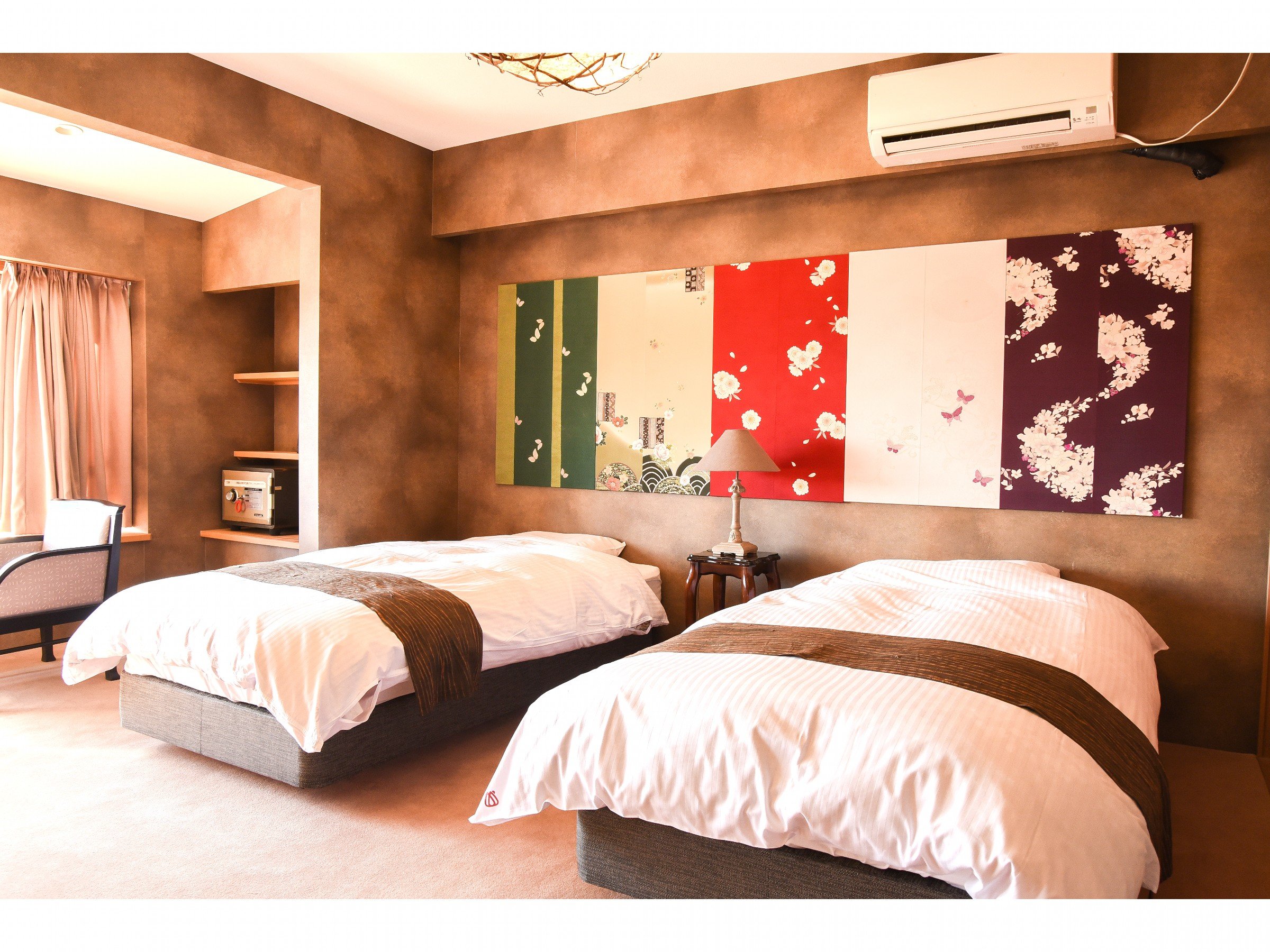 ■着物の趣に触れる二間の空間 モダンな和室とゆったり寛げるベッドルーム。ベッド上の着物パネルや色鮮やかな椅子など和の美しさに浸る上質な大人の休息をお約束します