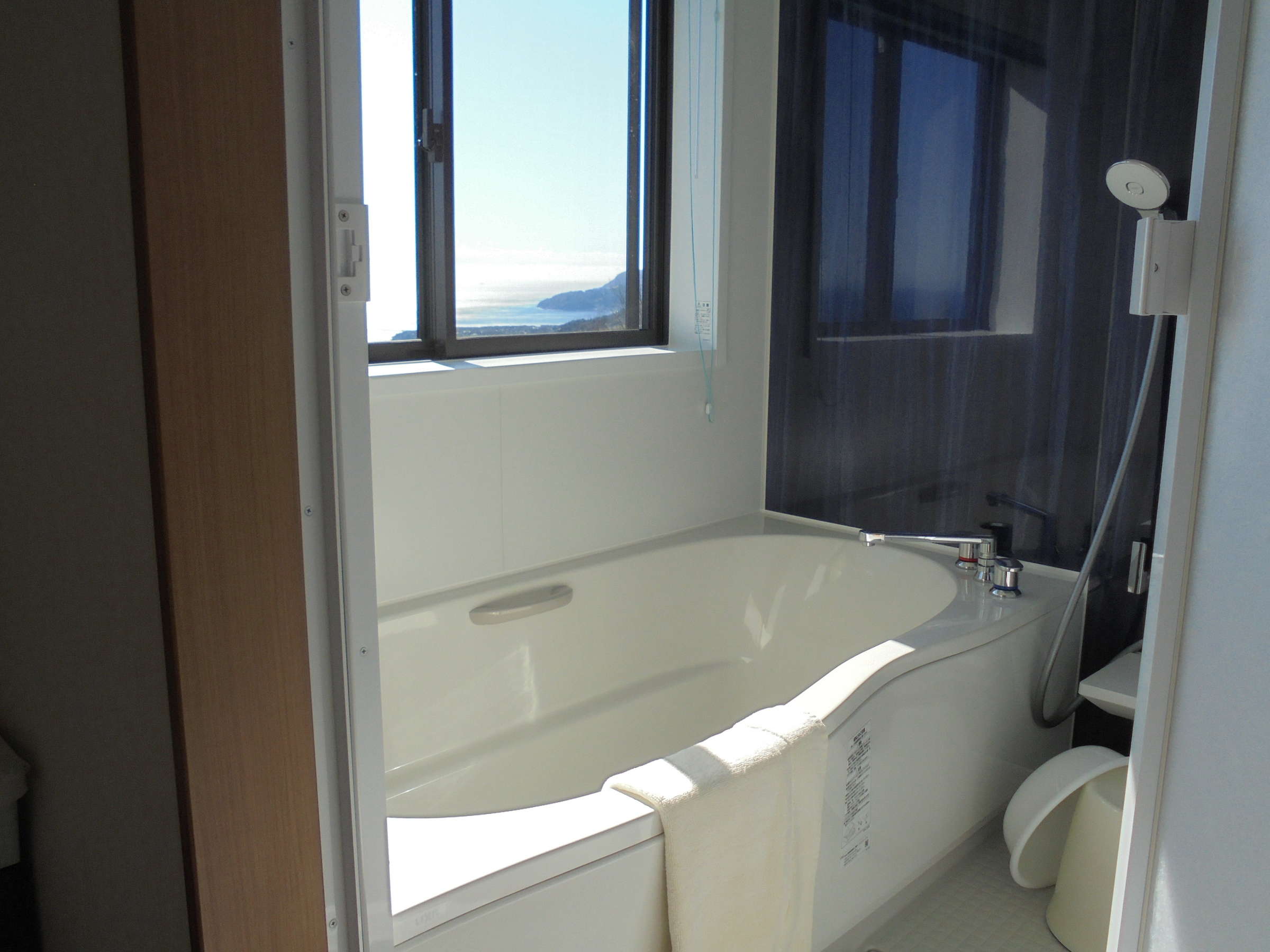 ツインルームスイートのお風呂の窓から海が見えます。
