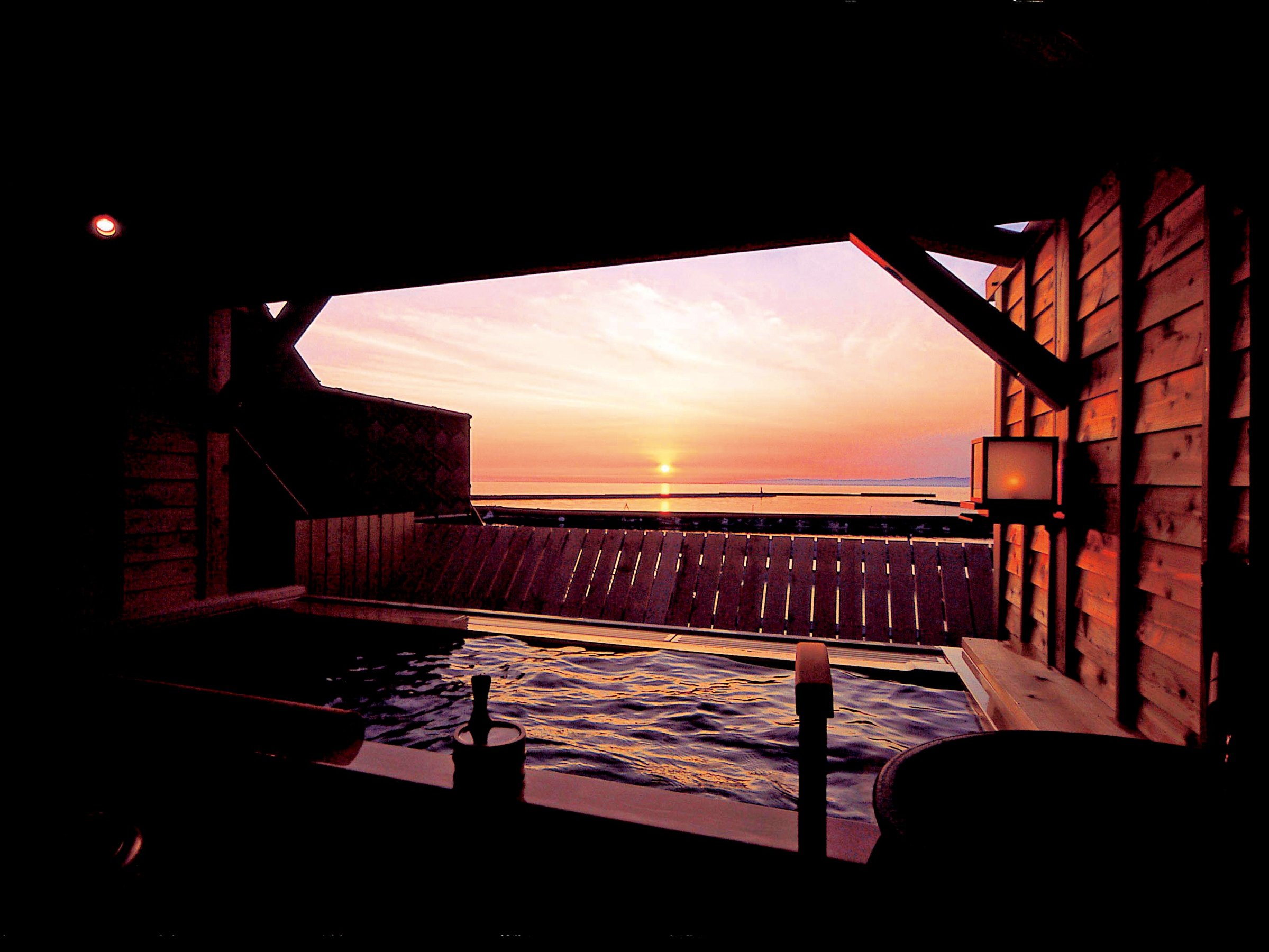 【露天檜風呂】水平線に沈む夕陽を見ながら浸かる、癒しのひと時♪