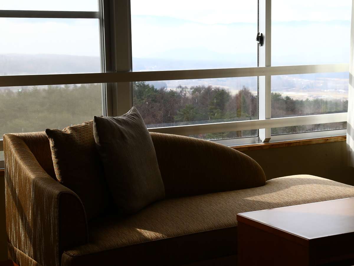 大きな窓から自然を望む、西館和室のカウチソファ。ゆったり寛げる空間で旅の疲れを癒します。眺望が魅力。