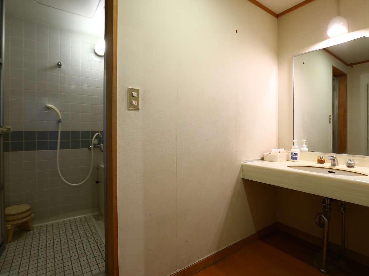 西館和室10畳+6畳の洗面・バスルーム。清潔感があり、ゆったり使える水回りで安心して滞在できます。