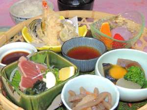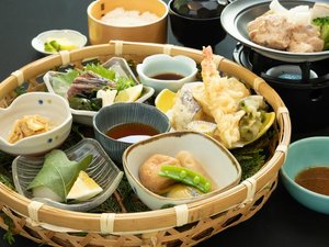 ゆの森【7・9~10月限定】【ネット限定】お料理グレードアップ天然鮎の塩焼き+土佐黒牛陶板焼き付き花籠膳