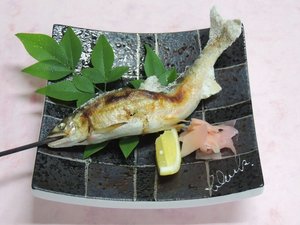 夕食の川魚料理を「天然鮎の塩焼き」へグレードアップ。