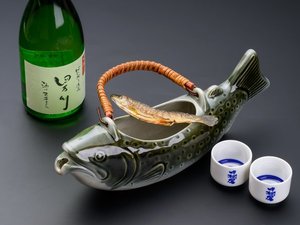 客室露天付き部屋プランに岩魚の骨酒をお付けするプランです。岩魚をカラカラになるまで炙り岩魚型の徳利に入れて強熱燗を注ぎ入れてお出しします。野露天付き部屋...