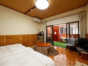 洋室の10畳でツインベッド、洗面台付きです。独立玄関から入室出来ます。ワンちゃん専用の檜露天風呂もついてます。温泉街を散歩するも良し、山道や広場。河原...